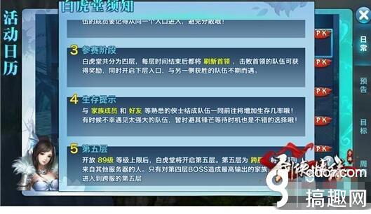 9月29日早11:00,跨服白虎堂第五层第一次开启。我们可以像以往一样,进入白虎堂,选择合适的入口参加。在前三层,都和以往的白虎堂一样。和家族成员一同前进,与其余家族对抗,清闯堂贼和各层的BOSS。