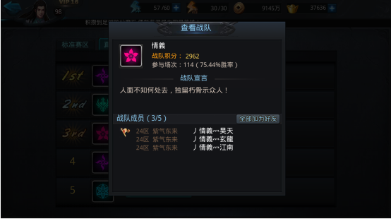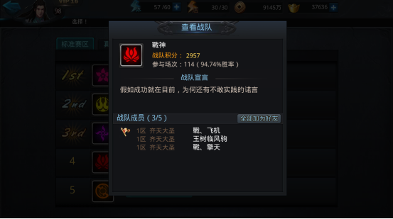 四、战神几经浮沉,战神队曾在前5个比赛日领航,但后续却反复遭遇败绩,曾经跌出前5,甚至差些跌出前10。所幸的是,其队长战飞机极具指挥能力,三位成员众志成城,就如其战队宣言一样“假如成功就在眼前,为何还有不敢实践的诺言”,他们奋勇杀敌,一步一个脚印,一场一个进步,最终在后5个比赛日再次回归前3,并且保持稳定。