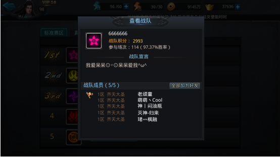 7个6战队的队长老顽童为自己的队伍写下了“我爱呆呆,呆呆爱我”这样的萌萌哒战队宣言,他与萌萌cool、神闷油瓶、灭神归来、珺枫融等伙伴相处融洽,人帅心仍萌,在萌萌达的状态下表现出了专业战队的高水准。