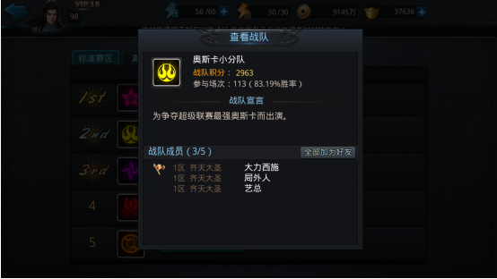 二、奥斯卡小分队奥斯卡分队是本次标准赛区中的最大黑马,他们在前18个比赛日都不曾进入前5排名,但他们也不曾掉出前10区间,也就是说这支来自一区的黑马战队,一直紧跟第一梯队的节奏,在第十九个比赛日以2963分脱颖而出,跻身线下对决,让我们记住这三个名字,1区大力西施,局外人和艺总。
