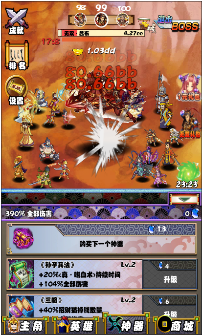 4、游戏的养成玩法,点击三国的养成方案十分开放,除去上文所讲的武将,你还可以升级主角自身攻击力,来获得爆表的输出伤害。屏幕中红色的数字便是你攻击敌方所产生的成吨伤害,在足够的伤害面前即便是勇猛无双的吕布,也可以在限制时间内,不用担心挑战失败而轻松地完成点杀!