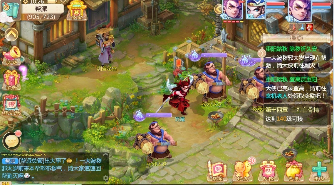 驱秽邪祈久安 重阳节帮派玩法即将登场作为中国传统文化节日,重阳佳节有辟邪除害的风俗,在传统重阳佳节来临之际,官方将上线“除秽祈久安”玩法。一大波秽邪太岁将于每日11:15、15:15、19:15出现在帮派场景中散布秽气,众位大侠可集合三人队伍,击杀秽邪太岁为帮派驱除秽气!