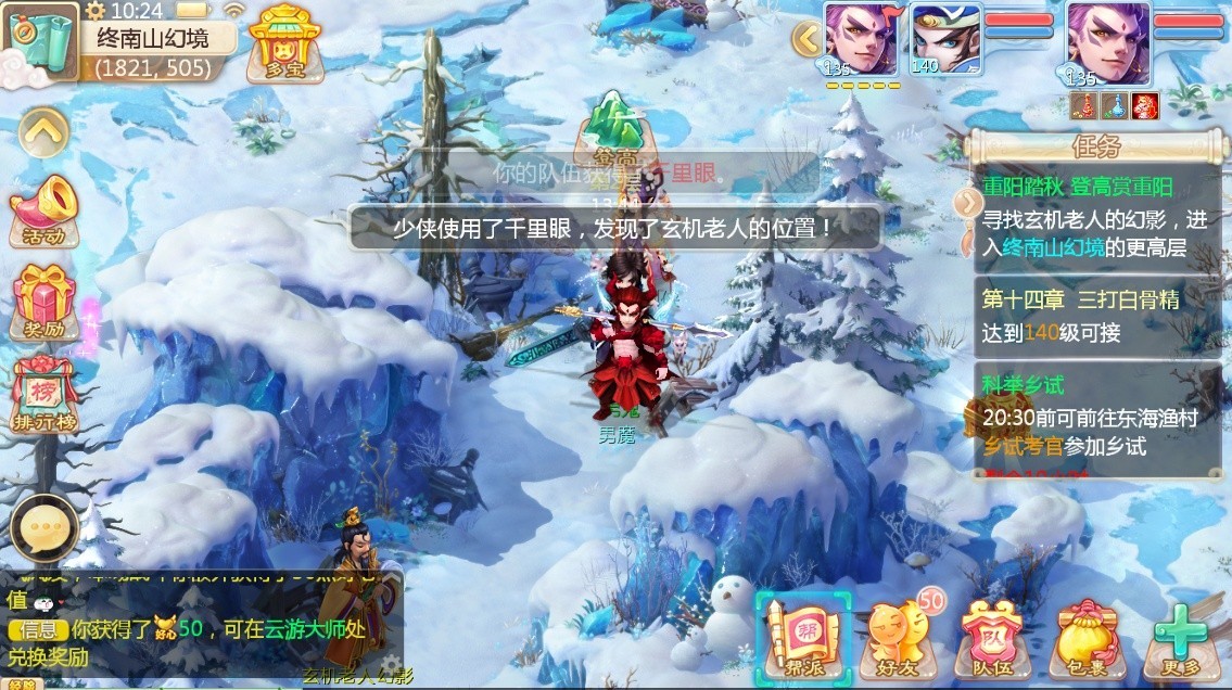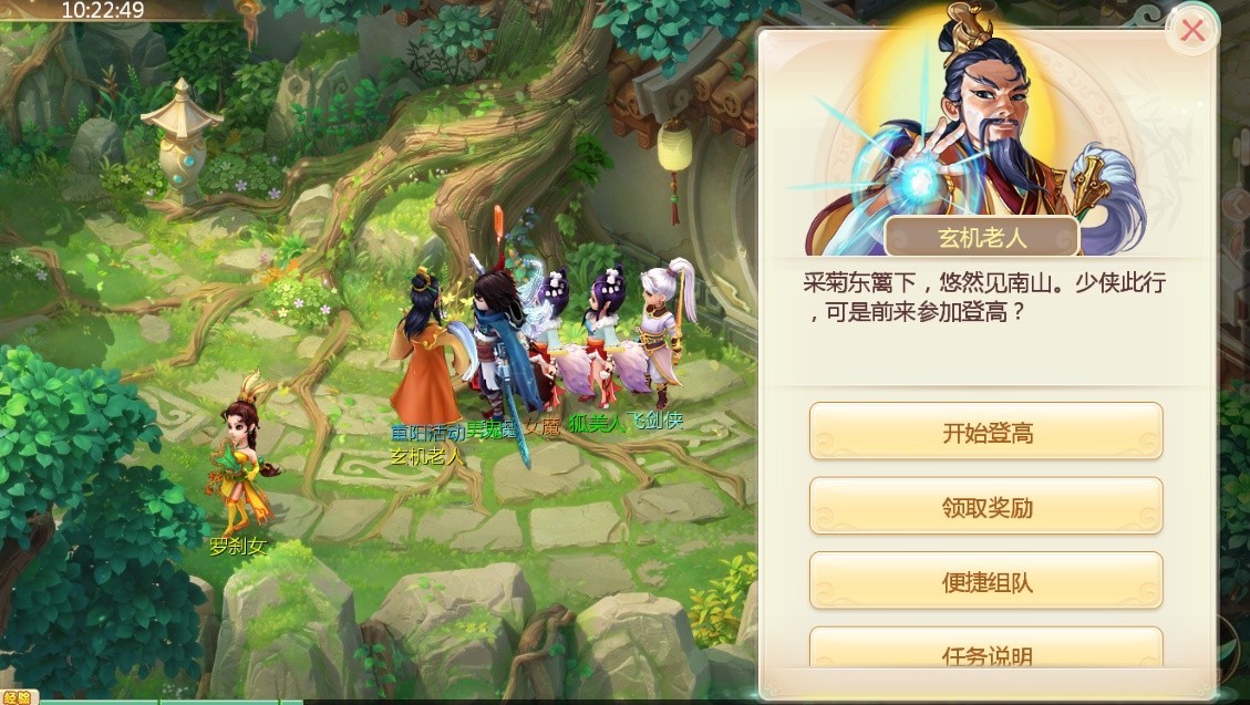 参与节日趣味游戏玩法,寻找“玄机老人”加入重阳登高竞赛,玩家除了享受登高远眺的悠闲逸趣外,在寻找每层“玄机老人幻影”的过程中,还有惊喜山间秘宝、全员变身等趣味游戏玩法设计等待玩家发掘!根据玩家登高层数,在任务结束时更有人物经验、游戏道具等丰厚节日游戏福利发放!