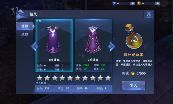 在玩家达到13级开启,玩家可以通过进阶披风来升级战力,进阶前玩家需对披风注入风魂,每次注入会有一定的成功率,每次注入失败时,会增加幸运值,幸运值越高,成功注入几率越大。注入所需的风魂值会随着披风的进阶而增加,当风魂不够时,玩家可选择是否用钻石代替风魂来注入。当披风注入满了风魂以后,玩家可对披风进阶,进阶需要披风进阶石,进阶石的需求量也会依据披风进阶而增加需求量,每次注入成功或进阶成功多会增加部分战力,现阶段披风最高阶级为10阶,后续会增加相应的阶级。