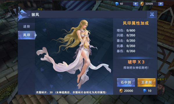 风印将在玩家到达35级开启,解封需要风印石,披风的进阶数会影响到风印属性加成上限,所以当风印属性加成满了时,只能对披风进行进阶,从而增加风印属性上限。解封风印时可选用金币或者钻石对风印女神进行砍击,选用金币只会提升小部分属性,选用钻石每次会提升20属性值。