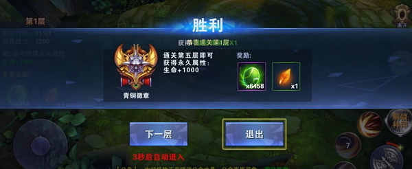 每一层只有一只怪,并且只能打一次,打倒后通关,每关限制时间均为2分钟,玩家必须在有限的时间内把怪物打倒,在时限内未打倒或被怪击杀则判为失败,每通过一关后都会有对应的过关奖励,达到某层后还会有属性的额外加成。(即徽章的加成)