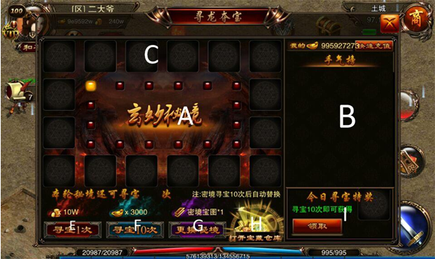 F、点击能进行10次寻宝,消耗元宝为3000,VIP玩家能打折优惠。