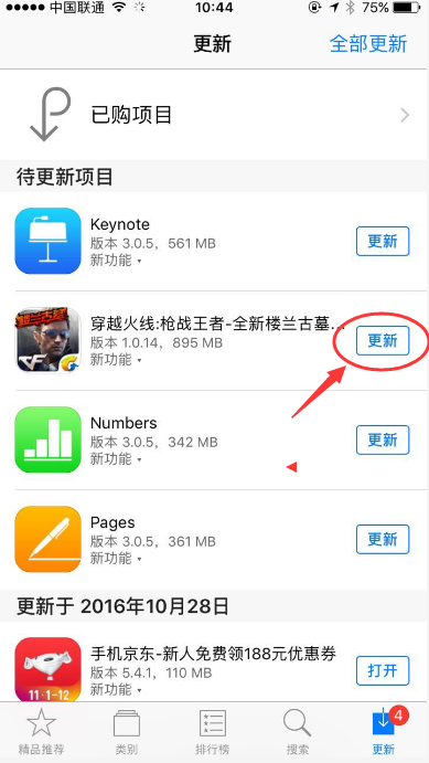 3、 此时依然可能无法看见游戏更新选项,请等待约1分钟(Appstore缓存刷新)后,即可看到更新选项,点击更新即可。