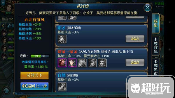 卡牌:卡牌可以通过试剑天下获得V6以上可以刷新,建议每次刷新到紫色以上在打。但是需要的金子多了就别刷新了~银子和金子充足的就去江湖游学获得。卡牌黑市有急需的可以购买