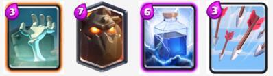 这套卡组平均耗费并不是很高,但是卡组的进攻核心比较耗费,所以此卡组的思路是打防守反击为主,打反击先沉底天狗,天狗过桥,预备箭雨和大电,有必要的话,冰法可配合天狗一起推进。有了冰法,就省去了箭雨。至于放置法师和重甲亡灵,那么大电就是为其准备的。天狗过桥后,可用矿工配合天狗一起攻击防御塔,第一次用大电攻击,对手绝对没想到。所以操作的好,可一次带走防御塔或将防御塔磨成残血。