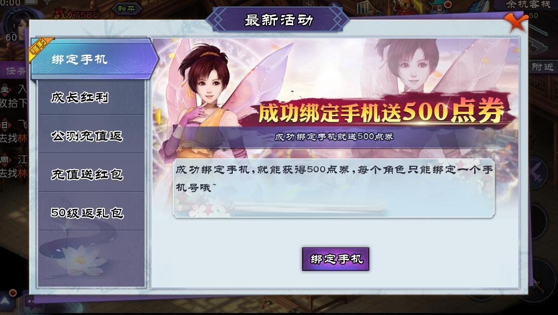 活动期间,只要成功绑定手机号码,就可以获赠500点券哦~