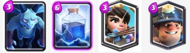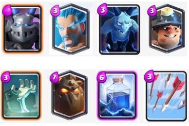 卡组思路:大电和矿工配合也是蛮好用的,这套卡组费用低,卡牌之间衔接快。同时这套卡组主要打进攻消耗,有费就可以进攻,利用矿工不断的骚扰对手的防御塔,让对面疲于防守,让对面抽不出高费卡进行反击。