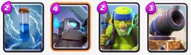 卡组思路:这套卡组是以防反打消耗为主,天狗过桥,利用大电清理对面的防守输出单位。再用大电去掉对面的防守单位后,可继续丢矿工配合天狗挖塔。卡组前期虽然打不出什么优势,但是越往后,对天狗越有利。