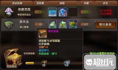 在活动界面你可以清楚地看到自己当前有哪些活动可以参加,活动任务完成得越多,就能积攒更多的活跃度积分。活跃度在每天从0升到100的区间有四个宝箱可以拿,都是很不错的东西。