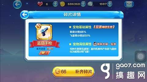 蓝晶手枪满级属性其实和飞星墨镜差不多,都是提高特种大尉的爆分能力,建议大家先收集蓝晶手枪,这款宝物的使用效果比飞行墨镜要稍微好点哦,想要收集特种大尉全部宝物,多赞万能碎片啦。