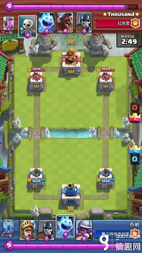 想必很多玩家都遇到敌方卡牌已经进入己方区域准备对护卫塔发起进攻而己方圣水又不足无法召唤卡牌,只能眼睁睁的看着护卫塔被攻击而无力解围,这时候骷髅兵就可以发挥作用了,比如敌方迷你皮卡/皮卡超人/王子/亡灵大军/狂暴樵夫/野蛮人等进入己方战场时,可以在己方战场中间靠近河流且要能吸引敌方军队的区域使用骷髅兵,这样敌方军队就会放弃护卫塔,改变攻击目标往骷髅兵的方向移动,敌方军队移动的过程中护卫塔就能攻击他们,敌方军队把骷髅兵消灭后往护卫塔方向移动同样需要时间,1圣水的小骷髅兵就能为己方争取好几秒的时间,我方就能使用其他卡牌解围,避免护卫塔被摧毁!