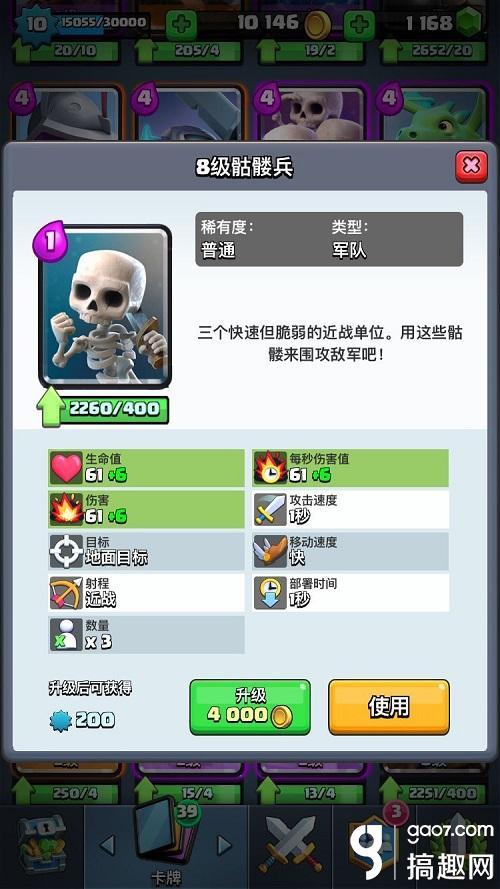 骷髅兵同样可以用来进攻,不过只能辅助进攻,比如跟野猪骑士配合,野猪冲在前面,骷髅兵跟在后面,而且只需要消耗5圣水,可别小看骷髅兵,如果不及时应对,野猪骑士和骷髅兵很轻易就能把护卫塔给摧毁的!也可以掘地矿工为主,小骷髅/哥布林投矛手辅助,掘地矿工可作为小坦克吸引火力,小骷髅/哥布林投矛手疯狂输出,小骷髅/哥布林投矛手攻击速度都非常快,护卫塔非常容易就被打成残血!