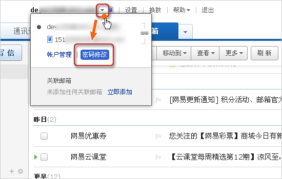 方法二、 登录网易免费邮,或 网易VIP邮箱,点击左上方邮箱地址后的“▼”小按钮,再点击“密码修改”,如下图:(在到达的页面中,根据提示修改即可。)