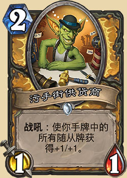 炉石传说污手街供货商卡牌效果:战吼,使你手牌中的所有随从获得+1/+1。来自龙争虎斗加基森系列拓展包的圣骑士职业稀有卡。[INC=http://hs.mofang.com/zt/inc/zhenghe.html]