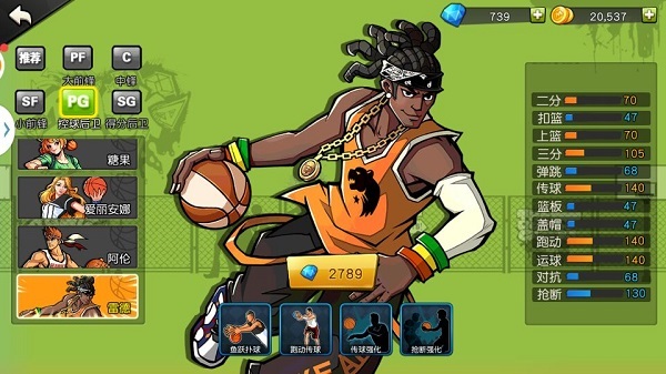 4、 运球强化、抢断强化、传球强化:三个被动技能用于全民辅助PG自身属性的成长,只为最大限度的增强团队大脑的能力