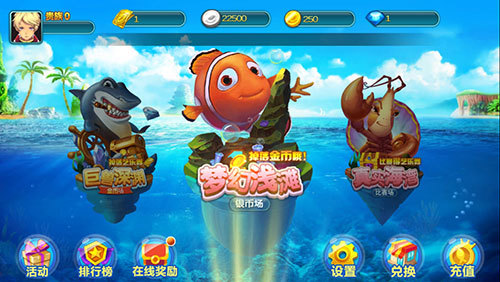 首先呢,大捕鱼时代里面有三大秘境:梦幻浅谈(银币场),巨兽深渊(奖券场),真实海湾(未开放)。不同赛场万人争霸,银币场是当自己金币不够的情况下又不想充值,那就去银币场打金币,当热,也可以在银币场练练技巧;奖券场故名思议就是打奖券和金币的,打到足够多的奖券(最低是1000奖券)那就恭喜你可以兑换实物奖励或者话费、购物卡了;