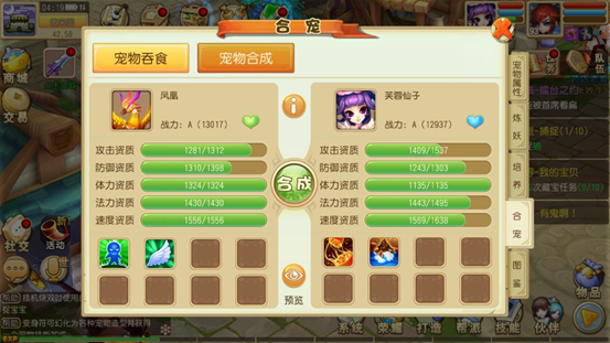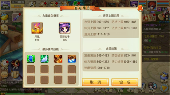 宠物合成:有几率获得更多的宠物技能以及提高宠物资质上限。