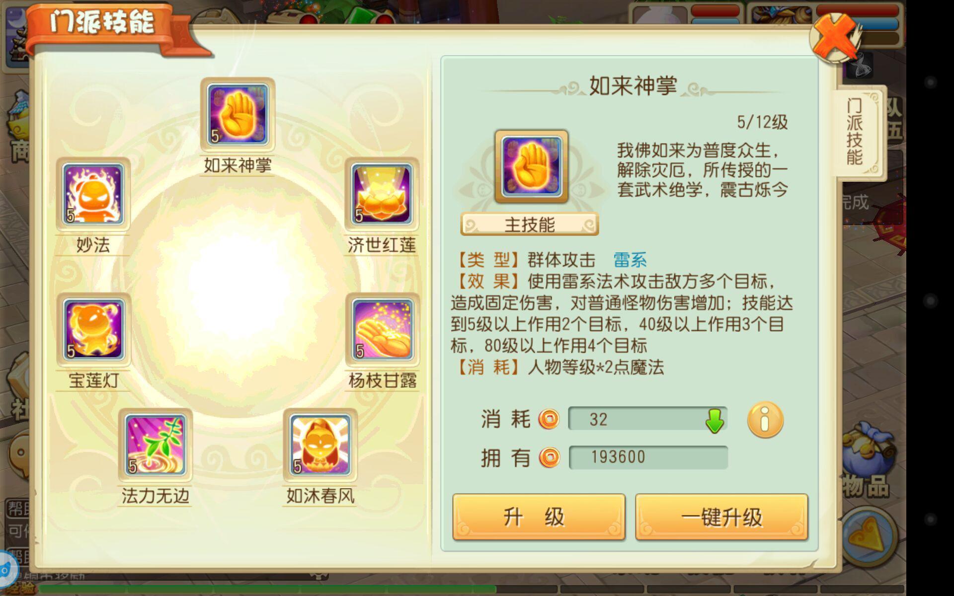 技能效果:使用雷系法术攻击敌方多个目标,造成固定伤害,对普通怪物伤害增加;如来神掌技能达到5级以上作用2个目标,40级以上作用3个目标,80级以上作用4个目标