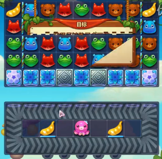 随着关卡中的障碍物消除之后,只要消除底层出现的动物,金豆荚就会顺着传送门来下落到底层的位置上去,所以想要收集金豆荚,首先要让金豆荚下落到底层。消除障碍物。