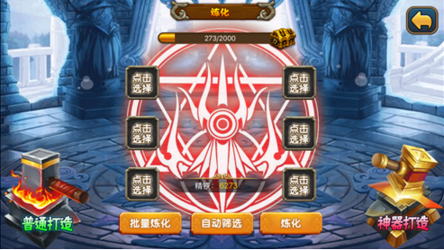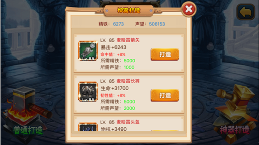 普通打造:在普通打造界面可以打造强力装备,紫装、橙装、道具、甚至神器均可在次打造
