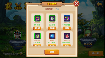 荣誉商店说明:在荣誉商店内可以使用荣誉值购买超值商品,神器碎片、宝石、BOSS挑战令、打孔符等超值道具均可在此购买