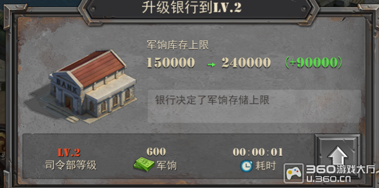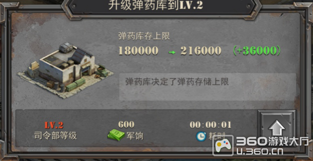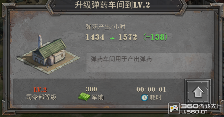 ★弹药车间:弹药车间主要产出军饷,随着车间的等级提升,弹药的产量也会同步提升,如当前弹药达到储存上限,则无法收取车间弹药;
