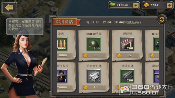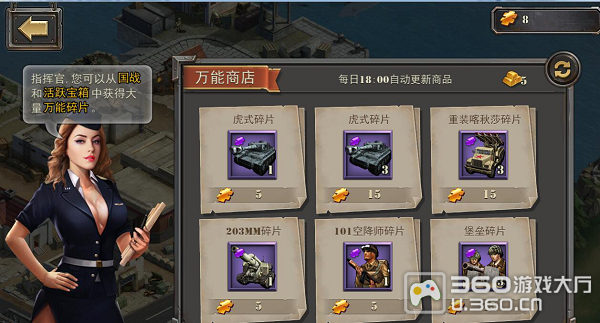 ★军用商店:产出各类资源的商店,每天9:00,12:00,18:00自动刷新商店物品,同时可使用黄金手动刷新物品;