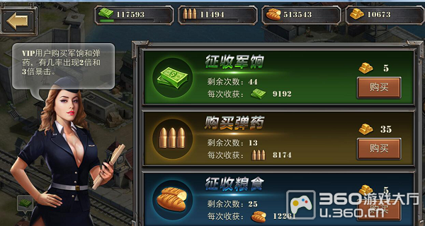 ★军需站:免费获得军饷和弹药的地方,每天各会有10次免费,免费用完也可以使用黄金购买,同时每通关1个主线关卡可额外获得1次免费,免费次数每天重置;