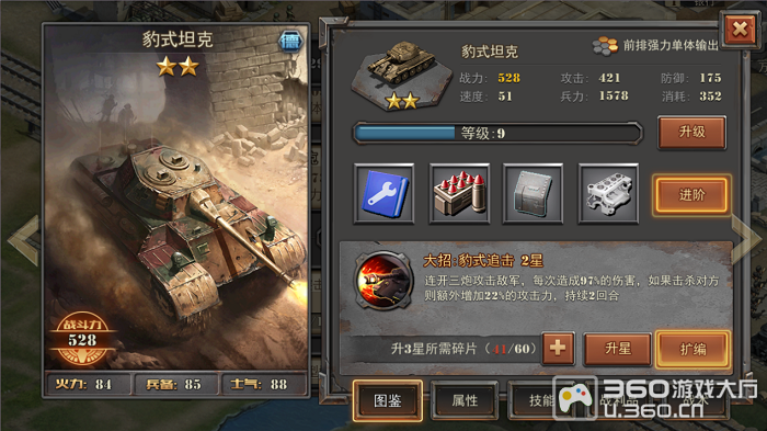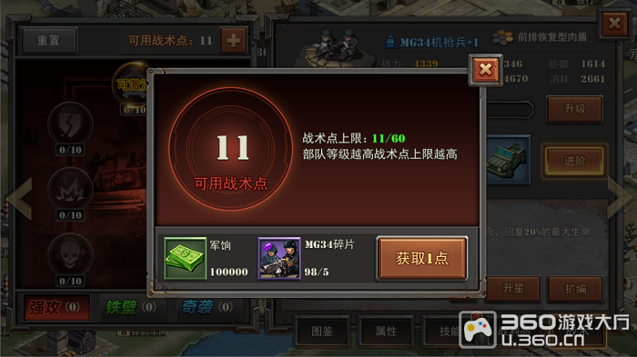 部队战术开启条件(部队需要5星、部队等级达到57级),部队满5星碎片多出来时,可以通过“战术”栏中消耗部队碎片兑换战术点,为部队提升战术属性。