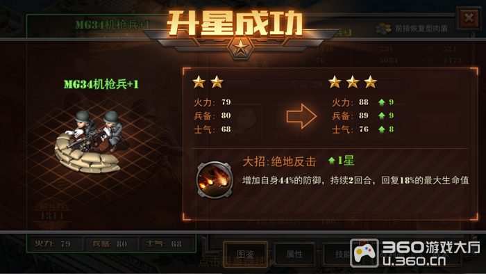 获取对应数量的部队碎片,可提升部队“星级”,部队升星后可提升部队属性、部队大招伤害!