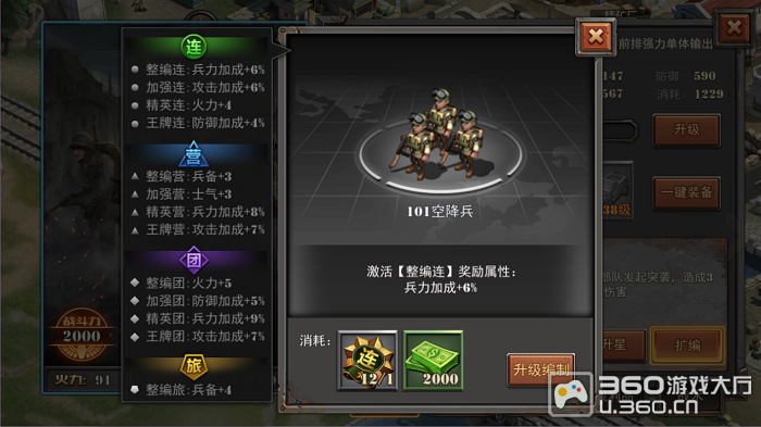 装备齐4件对应部队装备后,开启部队进阶按钮,部队进阶可大幅提升部队品质及战力!