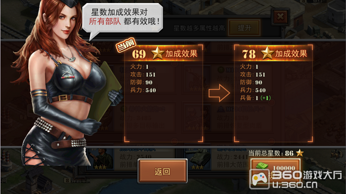 按指挥官所有的部队星级数量,消耗军饷提升所有部队属性战力。