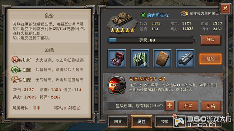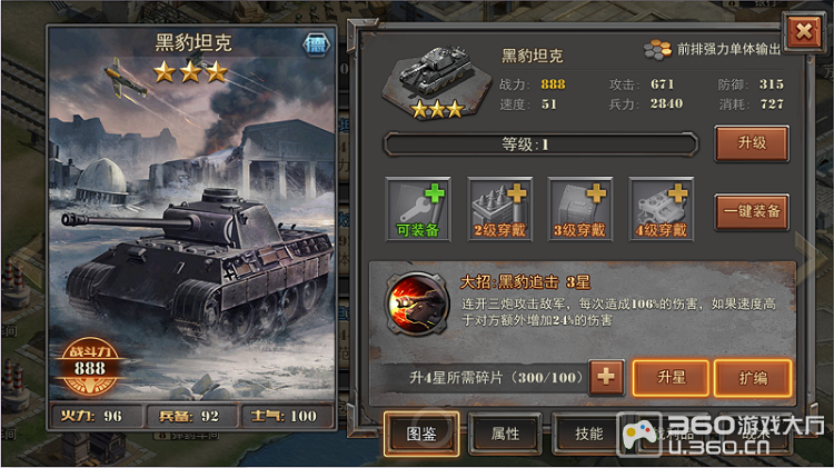 大招(豹式追击):连开三炮攻击敌军,每次造成伤害,如果击杀目标则额外增加伤害,持续2回合。