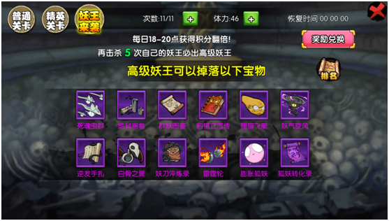 每次刷完精英关卡都会触发妖王来袭,触发来的妖王可以让全服人来打,这个是标记名字ID的,比如是你触发的,那么这个妖王就叫你的妖王,但是这个妖王可以让所有人来打,而且一个人打的时候不允许其他玩家打,不管打不打的死都会给奖励,打死会给更好的奖励,可以,高阶武器碎片或者高阶武器!并且按照上面规定的数量,打死自己的妖王就会得到指定的超级棒的装备哦,所以打完精英去打妖王一定要手快,别被别人抢走。