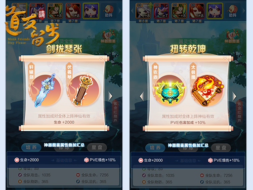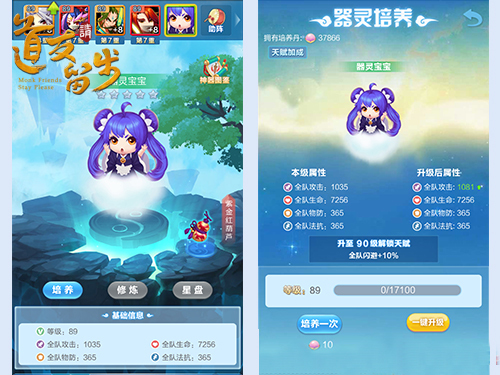 说到神器当然不得不提到神器系统,在阵容界面除了主角和五位上阵神仙,还有一个器灵宝宝,有着萝莉的外表,却有毁天灭地的能力。因为她掌管着我们所获得的所有神器,我们要通过喂养她,来提升自己身的属性,已经发挥神器的威力。