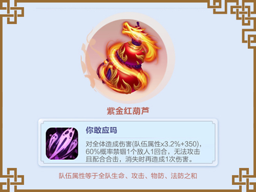 另外一个重要的神器就是最新的神器紫金葫芦,在仙盟宝库里兑换获得。大部分的道友都是,从轩辕剑到伏羲琴,再到太极图,然后换到现在的紫金葫芦。紫金葫芦的威力我想不用多说了,如果你的脸够好,简直就是决胜的关键。因为它的神器特效除了能给对面的造成全体伤害,还有机会禁锢对面一个敌人,想想如果能直接控制住对面的攻击型或是怒气型红色神仙,胜率就已经超过一半。所以装备紫金葫芦的玩家们,攻打副本时,如果差一点伤害失败,不妨多试几次,也许人品爆发,就把对面的关键人物吸了。