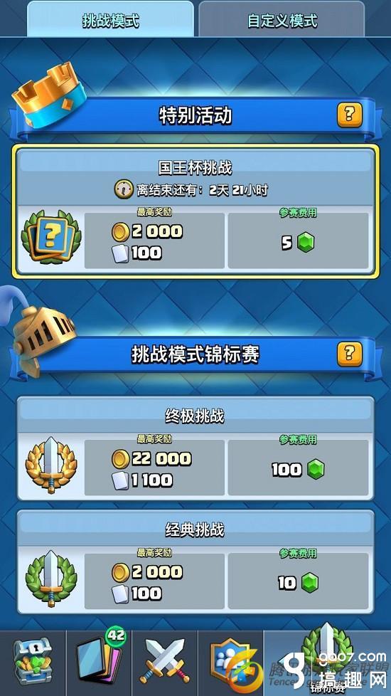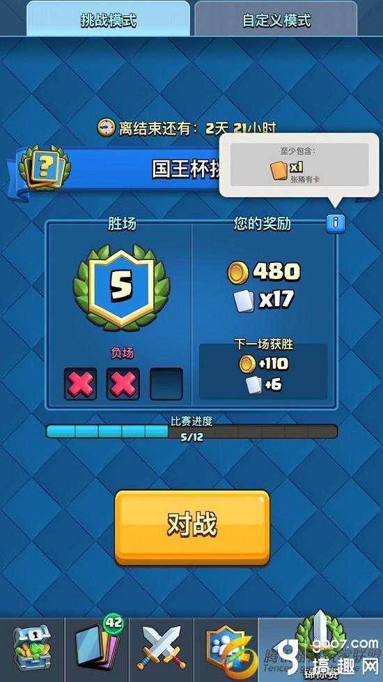 国王杯挑战是非常有趣的对战模式,让玩家不再拘泥于一成不变的出战卡组,丰富了对战玩法。何况国王杯挑战输赢与奖杯无关,可在实战中锻炼使用不同卡组的技巧,参赛费用只要5宝石而已。国王杯挑战只是为期三天的活动,每天别忘了报名参加比赛。