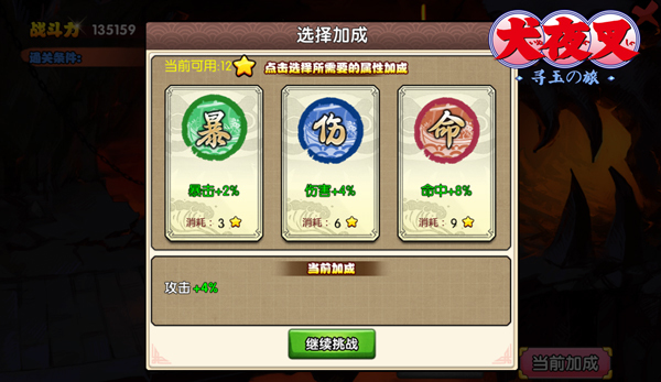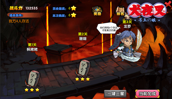 关卡的3个难度分别对应着1,2,3星。成功通过关卡就能获得相应的星星,从而在晋级的时候选择用星星为自己的角色提升一定的属性。该玩法里,只要失败一次就要重新来过了的,每天有重置一次的机会,玩家不要贪星星而选择了过高的难度导致过不去哦。