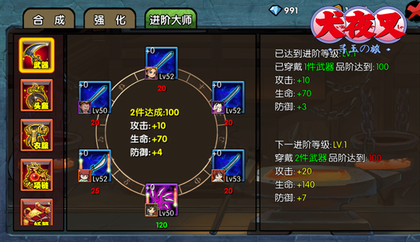 1.装备:装备一般都有着强化功能,前面提到过《犬夜叉》是节奏感较为快的一款手游,它同样把强化的这个步骤让玩家在上面消耗的时间大大减少了,只需要一个按键就可以让所有装备都强化到玩家目前的最大值。而在收集上,玩家获得大量的装备时,可以选择的不仅仅是出售,可以把5种同阶等的装备熔炼在一起来合成高一阶等的装备。
