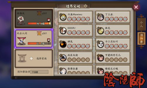 3、阴阳寮结界突破除个人战斗外,还可以和阴阳寮其他成员组队进行