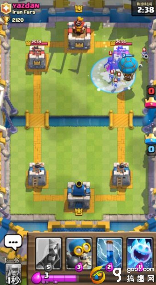 电击法术、冰冻法术、冰雪精灵起到主要的控制作用,气球是比较重要的一张进攻卡牌,三张法术卡牌的融入使气球的输出更具稳定性。开局4张牌中有气球、冰精灵和小电,就可以进攻一波,小电随时伺候,冰精灵记得在气球后1-2秒再放。
