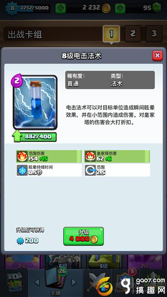 电击法术拥有1秒的控制时间可以让气球多输出一到两下,大量提高了气球对防御塔的伤害之余还能起到一个清场的效果,在同一环境下任何哥布林都是被一电带走。