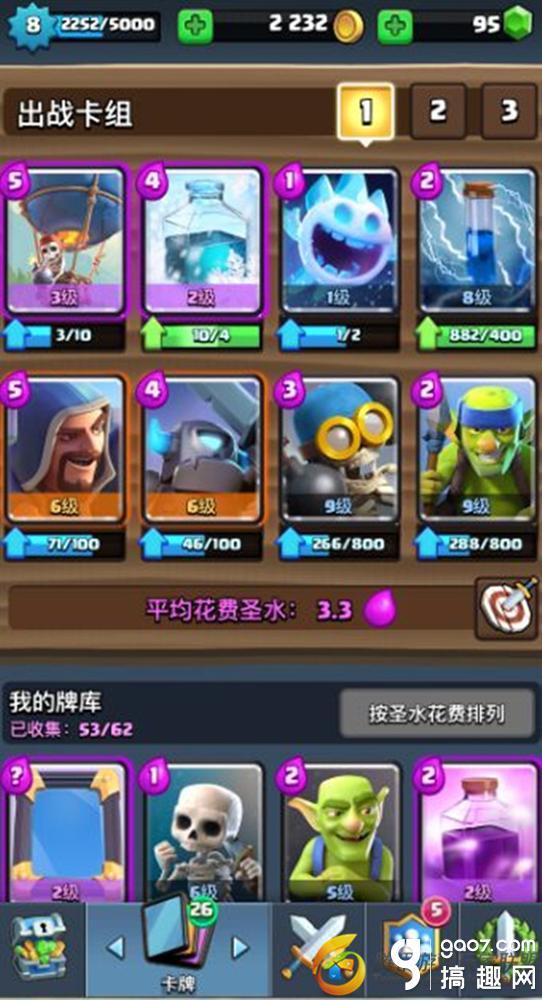 该卡组平均花费圣水3.3,费用低一直是气球流的核心套路,用最低的费用做最多的事情,而且这套卡组三张控制卡牌,搭配上法师远程AOE输出,打起来非常有优势。当对手地面部队到达桥头时,那么小皮卡+炸弹兵+哥布林投矛手则是很强的防守。