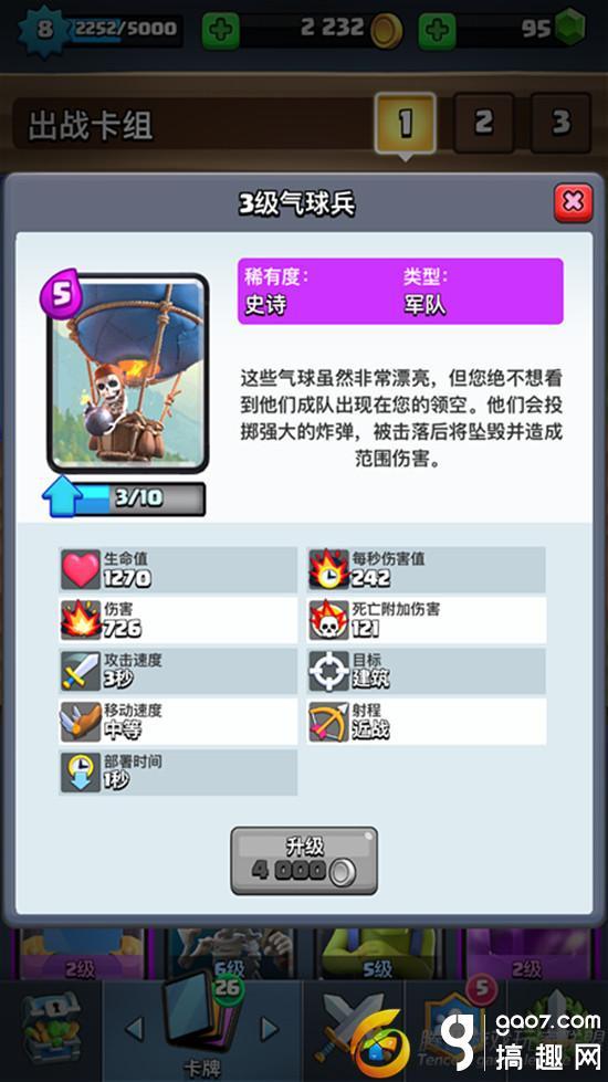 气球兵A2竞技场解锁的5费空中卡牌,具有高伤害、只会攻击建筑单位等特点。由于血量不高,特别需要其他卡牌的配合,因此该卡组中配合上三张法术卡,对于气球摧毁公主塔非常有效。