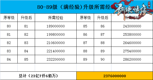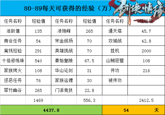 对以上所有的活动进行统计,得出领先于服务器所有人的职业少侠一天可得经验约为4450W,从80升到89需47天,升到89满经验需54天,约4-5天升一级。由于领先于服务器本身就在开新等级上限前存了足够升到82-83级的经验,所以,升到89级只需33天左右。